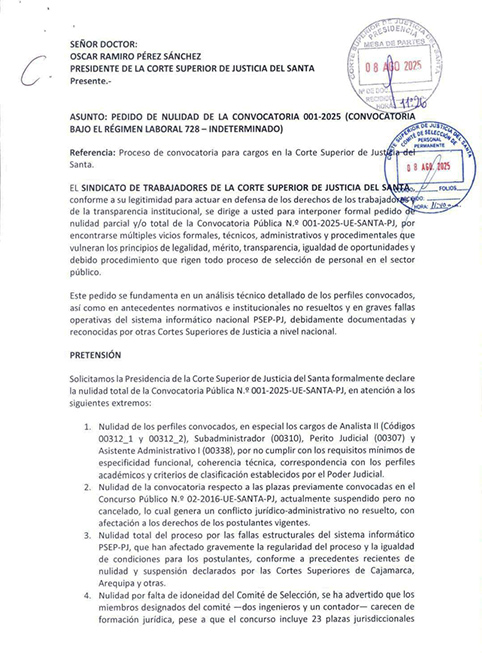 A nuestro medio llegó el pedido de nulidad de dicha convocatoria 001 – 2025 dirigido al Dr. Oscar Ramiro Pérez Sánchez, presidente de la Corte Superior de Justicia del Santa, que está firmado por el secretario general, Carlos Palacios Díaz, en el que expone las razones.