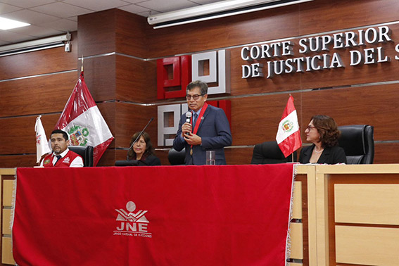 A su vez, el doctor Vizcarra Tinedo juramentó a los integrantes del JEE, la Dra. Daniela Valencia Lara, representante del Ministerio Público, y la licenciada Edita Jesús Díaz Mujica, representante de la sociedad civil. Además, se realizó la juramentación del abogado Hing David Díaz Alegre, secretario del Jurado.