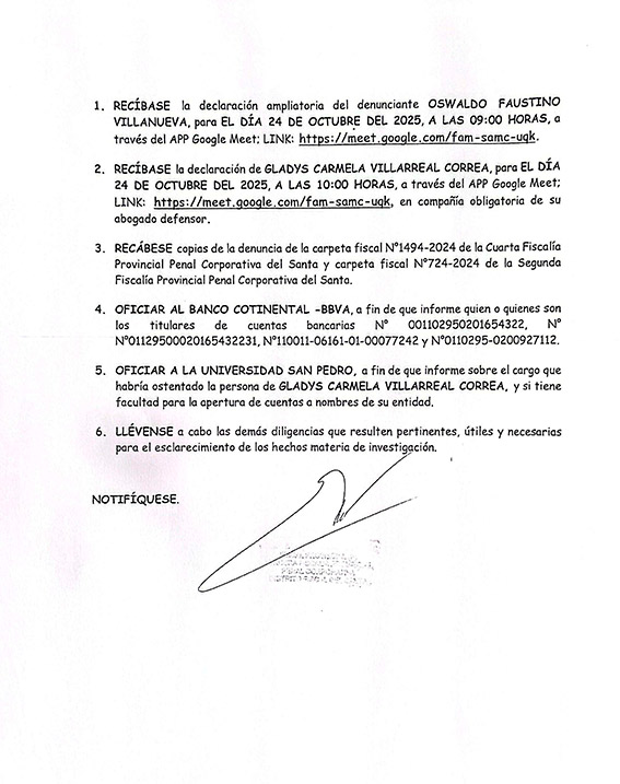 La fiscalía también está oficiando a la Universidad San Pedro para que informe si Villarreal Correa tiene facultades para aperturar cuentas a nombre de la entidad. Así mismo ha solicitado las copias de dos carpetas fiscales de la cuarta y segunda donde se investigas hechos complementarios a esta denuncia.