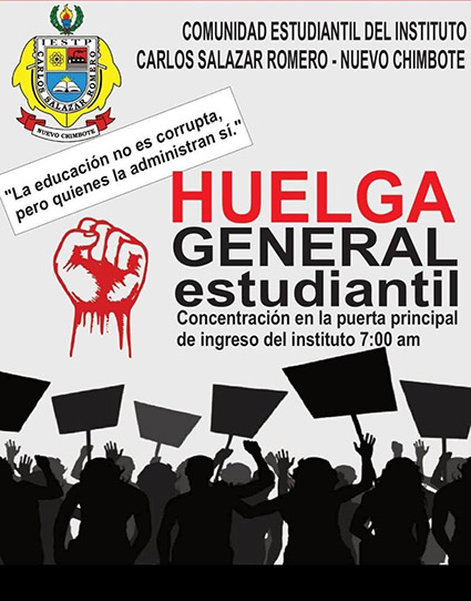 La comunidad estudiantil del Instituto Superior Tecnológico Carlos Salazar Romero de Nuevo Chimbote anunció el inicio de una huelga general este lunes 20 de octubre, en protesta por presuntas conexiones clandestinas de energía eléctrica dentro del plantel.
