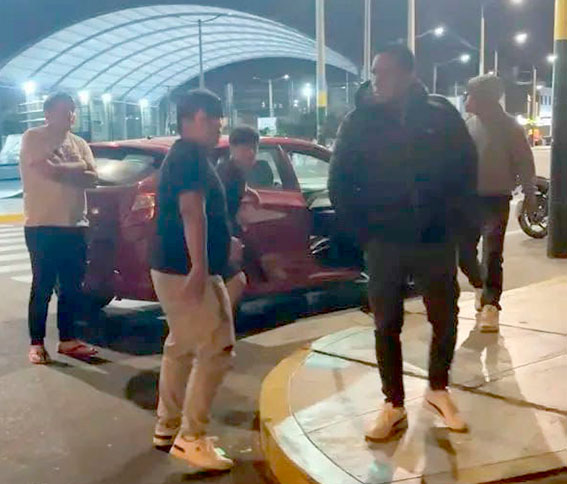 De pronto, un automóvil de color rojo y una motocicleta con dos ocupantes se detienen a pocos metros del grupo. Segundos después, uno de los sujetos desciende del vehículo y se lanza contra uno de los jóvenes iniciando el ataque.