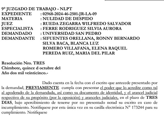 El Noveno Juzgado laboral de la Corte del Santa ha emitido la resolución número tres del quince del presente donde solicita a la Universidad San Pedro que acredite a su representante legal en el juicio que se sigue por nulidad de despido de cinco trabajadores ex integrantes del Sindicato de Trabajadores no Docentes.