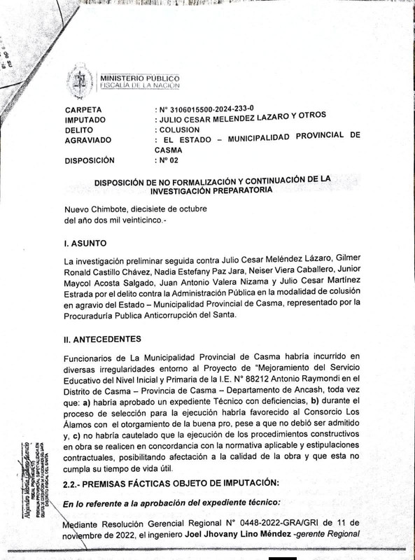 Mediante Disposición N° 2, la Fiscalía Anticorrupción del Santa, en la denuncia por Colusión que se le sigue al alcalde de Casma Julio Meléndez y quienes resulten responsables, por la obra de la I. E. Antonio Raimondi, emitió la opinión de No Formalización y Continuación de la Investigación Preparatoria y el archivo del caso.