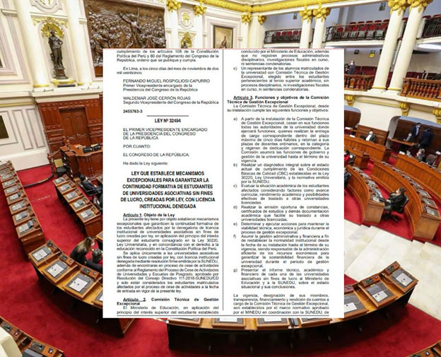 Como ya ha sido de conocimiento público esta ley está dirigida para garantizar la continuidad de las universidades asociativas con licencia denegada y en problemas como es la Universidad San Pedro cuyas autoridades han sido rechazadas y no cuentan con personería jurídica habiendo sido observadas por Sunarp.