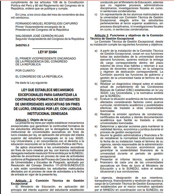 Se ha publicado, hoy, en el Diario Oficial El Peruano, la ley 32494, que establece mecanismos excepcionales para garantizar la continuidad formativa de estudiantes de universidades asociativas sin fines de lucro, creadas por ley, con licencia institucional denegada. Se promulgo por insistencia por el propio congreso de la república habiendofirmado el primer vice presidente Fernando Rospigliosicomo presidente encargado y Waldemar Cerrón Rojas.