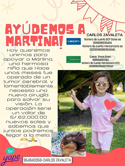 Ante ello, los padres de Martina han iniciado diversas actividades solidarias, entre ellas una pollada benéfica, con el propósito de reunir los fondos necesarios para la intervención quirúrgica y la recuperación de la menor.