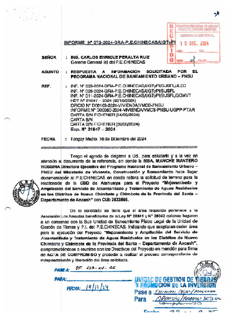 Luego en el Informe 073-2025-GRA-PECH, de fecha 16 de diciembre del 2024, Raúl Mendez Cruz, jefe de la Unidad de Tierras de Chinecas confirma que la Asociación referida acepta el compromiso y que se debe proceder al proceso de independización del terreno solicitado.