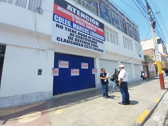 La Municipalidad Provincial del Santa, en cumplimiento del principio de autoridad promovido por el alcalde Felipe Mantilla Gonzáles, dispuso la clausura temporal del Colegio No Escolarizado “Marcos Libardoni”, tras comprobarse que no cumple con las condiciones mínimas de seguridad para su funcionamiento.