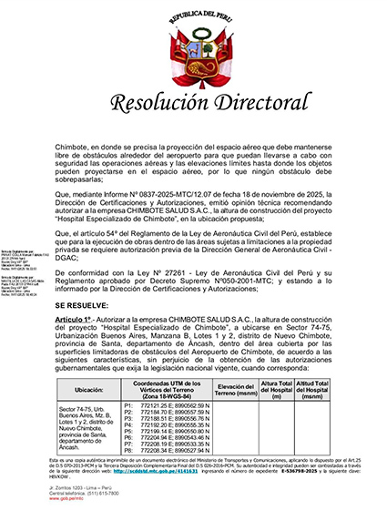 Tal como lo adelanto nuestro Diario en su edición de ayer viernes 21 del presente sobre lo que ya estaba decidido con el hospital especializado de Essalud, finalmente se emitió la Resolución Directoral N°0795-2025-MTC/12 donde se autoriza la altura oficial del edificio para dicho nosocomio.