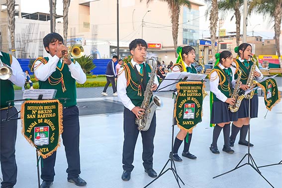 El evento se desarrolló en la Plaza Mayor de Nuevo Chimbote y reunió a estudiantes de diversas instituciones educativas que, con disciplina y talento, ofrecieron una tarde llena de armonía y espíritu artístico. Participaron las bandas de: