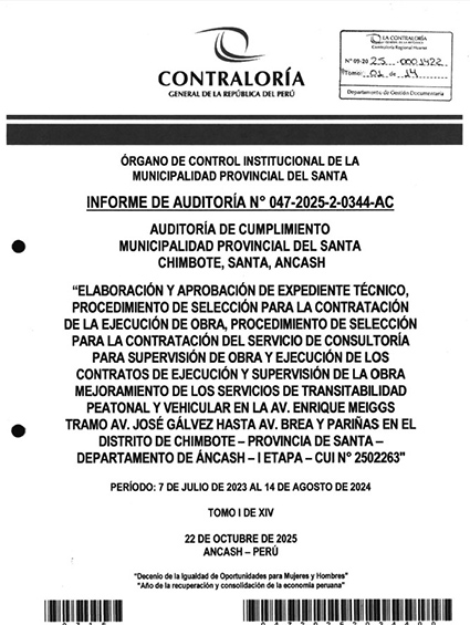 Se trata del Informe de Control Posterior N° 047-2025-2-0344, Elaboración y aprobación del expediente técnico, procedimientos de selección para contratación de ejecución de obra y del servicio de consultoría para supervisión de obra y ejecución de contratos de ejecución y supervisión de la obra “Mejoramiento de servicios de transitabilidad peatonal y vehicular en Av. Enrique Meiggs (tramo Av. José Gálvez hasta Av. Brea y Pariñas en el distrito de Chimbote”.