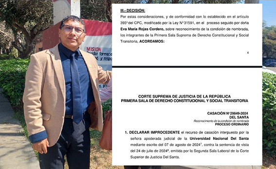 La Segunda Sala Laboral de la Corte Superior de Justicia del Santa admitió a trámite el recurso de casación interpuesto por la Procuraduría Pública Especializada en Materia Hacendaria y la Universidad Nacional del Santa (UNS) contra la sentencia que ordenó el reconocimiento como docente nombrado de José David Medina Moreno, correspondiente a un proceso de Acción Contencioso Administrativo.