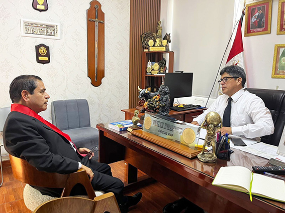 El presidente de la Corte Superior de Justicia del Santa, Dr. Óscar Pérez Sánchez, realizó una visita institucional al jefe de la División Policial de Orden Público y Seguridad (DIVOPUS) Chimbote, coronel Domingo Salazar Durand, con el fin de fortalecer el trabajo articulado entre ambas instituciones.