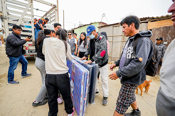 Asimismo, con el apoyo del personal de la Unidad Funcional de Participación Vecinal, se realizó la entrega de bienes de ayuda humanitaria, entre ellos triplay, calaminas, camas, frazadas, bidones, ollas, enseres básicos y víveres, con el objetivo de cubrir las necesidades más urgentes de los damnificados.