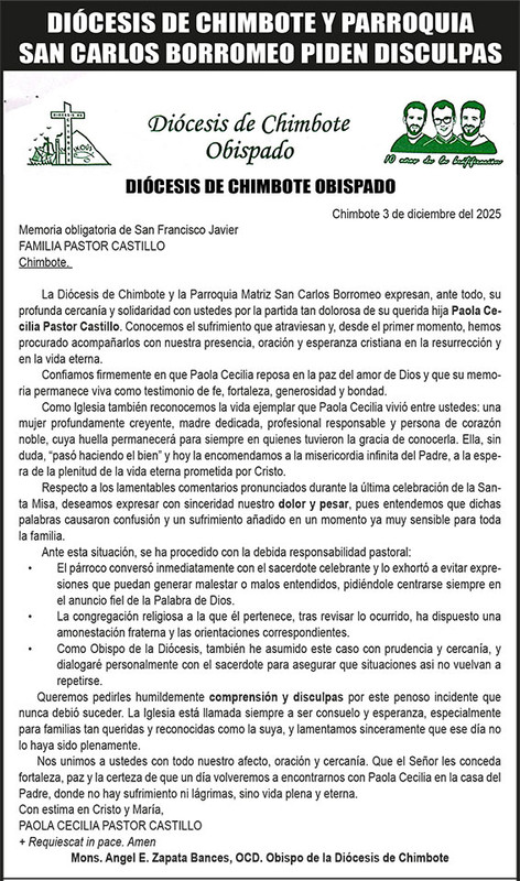 La Diócesis de Chimbote y la Parroquia Matriz San Carlos Borromeo expresan, ante todo, su profunda cercanía y solidaridad con ustedes por la partida tan dolorosa de su querida hija Paola Cecilia Pastor Castillo. Conocemos el sufrimiento que atraviesan y, desde el primer momento, hemos procurado acompañarlos con nuestra presencia, oración y esperanza cristiana en la resurrección y en la vida eterna.