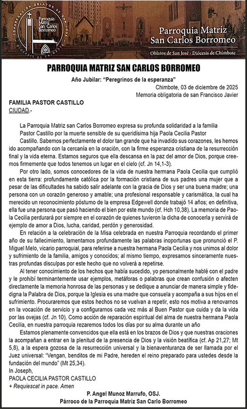 La Parroquia Matriz san Carlos Borromeo expresa su profunda solidaridad a la familia