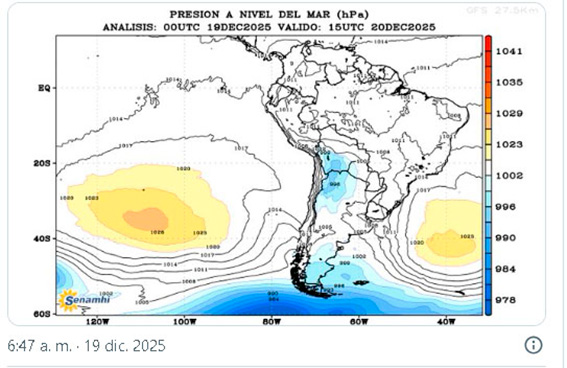 A través de su cuenta en X (antes Twitter), el organismo informó que el Anticiclón del Pacífico Sur “afectará a la costa peruana este fin de semana debido a su proximidad al continente”.