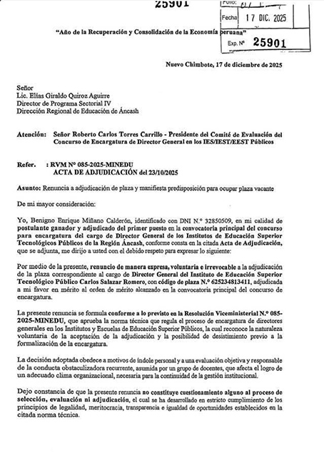 En su carta de renuncia, Benigno Miñano Calderón señaló que su decisión es expresa, voluntaria e irrevocable, y responde a una evaluación responsable del clima organizacional, precisando que no constituye un cuestionamiento al proceso de selección ni adjudicación del cargo.