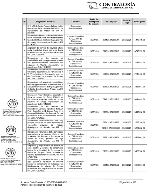 La Contraloría concluye que estas acciones afectaron la legalidad y transparencia del proceso de transferencia financiera, generando un riesgo en el uso adecuado de recursos públicos destinados a reducir brechas de infraestructura en la región Áncash.