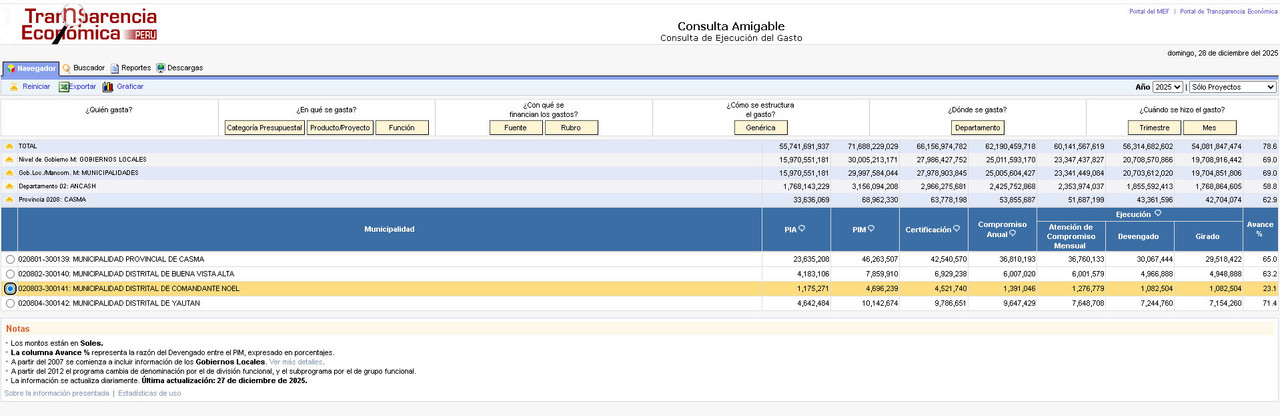 Según transparencia económica del MEF hasta ayer 28 de diciembre la Municipalidad Distrital de Comandante Noel ha ejecutado solo el 23.1% de su presupuesto de inversión pública pese a tener un presupuesto considerable de 4 millones 696 mil 239 soles.
