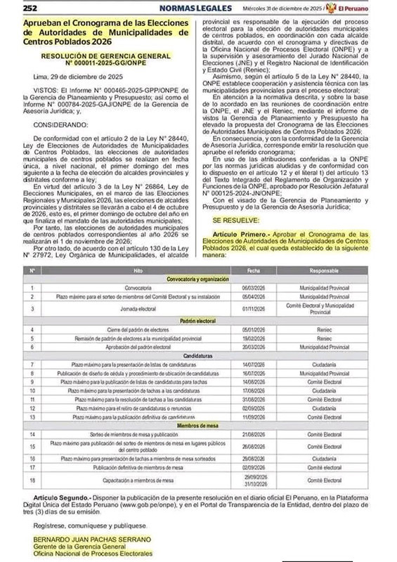 La Oficina Nacional de Procesos Electorales (ONPE) aprobó oficialmente el cronograma electoral para las Elecciones de Autoridades Municipales de Centros Poblados, proceso que se realizará en todo el país el 1 de noviembre de 2026.