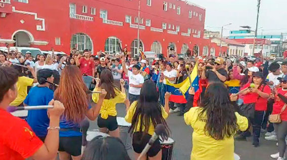 Con el paso de las horas, este escenario se vuelve cada vez más festivo. El sonido de las matracas, chicharras y vuvuzelas se escuchan a lo largo de esta zona de la avenida Arequipa; jóvenes bailan sus danzas tradicionales y los niños celebran con sus trompetas de juguete. Autos y motocicletas con banderas venezolanas rodean el lugar, bajo un amplio resguardo policial.