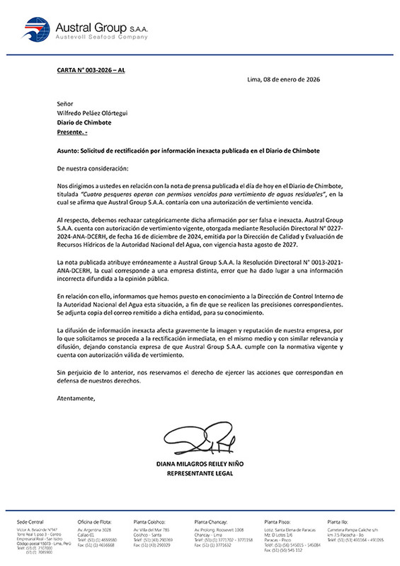 Nuestro Diario ha recibido la carta de la Empresa Austral Group SAA la que hemos procedido a publicarla. Sobre la información publicada en la edición de ayer debemos manifestar que tiene como fuente tal como se indica, al Informe de Visita de Control N° 027-2025-OCI/5740-SVC, que proporciona el nombre de las cuatro empresas que tienen las autorizaciones vencidas.