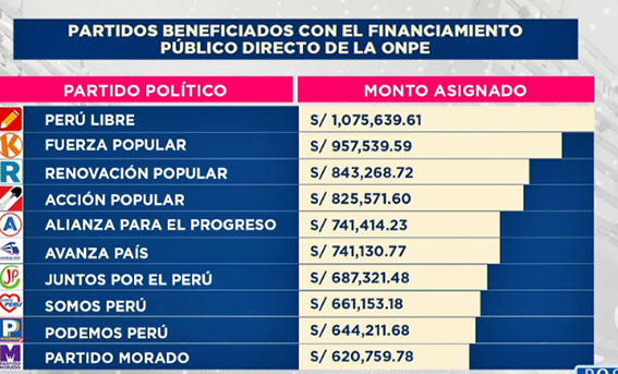 Los partidos políticos beneficiarios son los siguientes: Partido Político Nacional Perú Libre (S/ 1,075,639.61), Fuerza Popular (S/ 957,530.59), Renovación Popular (S/ 843,268.72), Acción Popular (S/ 825,571.60), Alianza para el Progreso (S/ 741,414.23), Avanza País – Partido de Integración Social (S/ 741,130.77), Juntos por el Perú (S/ 687,321.48), Partido Democrático Somos Perú (S/ 661,153.18), Podemos Perú (S/ 644,211.68) y el Partido Morado (S/ 620,759.78).