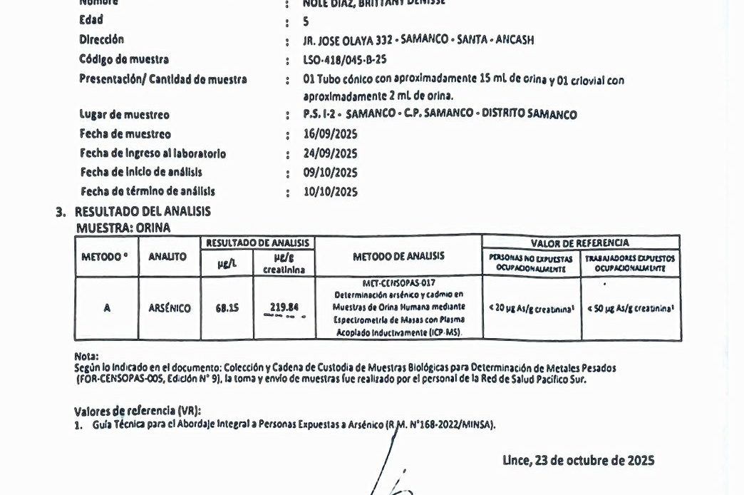 Los Informes N.° 10207, 10211 y 10223-2025-CENSOPAS revelan que, en junio de 2025, el nivel de arsénico alcanzó 0.0143 mg/L, superando el límite máximo permisible de 0.01 mg/L establecido por la Organización Mundial de la Salud (OMS). Especialistas del MINSA advierten que la exposición sostenida a este contaminante representa un riesgo grave para la salud infantil, con posibles daños neurológicos, renales y el desarrollo de enfermedades crónicas a largo plazo.