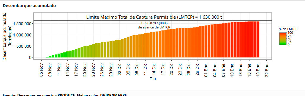 Mientras tanto el Imarpe ha dado a conocer que hasta el día 19 se pescó 1 millón 596 mil 879 toneladas que en significa el 98% de la cuota establecida de un millón 630 mil toneladas. Por lo tanto se espera ahora lo que viene para la primera temporada del 2026, con la SNP presionando para el siguiente crucero de investigación de Imarpe.