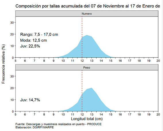 Según los datos que publica el Imarpe se ha pesado entre el 7 de noviembre y el 17 de enero un promedio de 22% de anchoveta juvenil, con una moda de 12. 5 cm y el rango de pesca ha sido entre 7.5 cm y 17 cm.