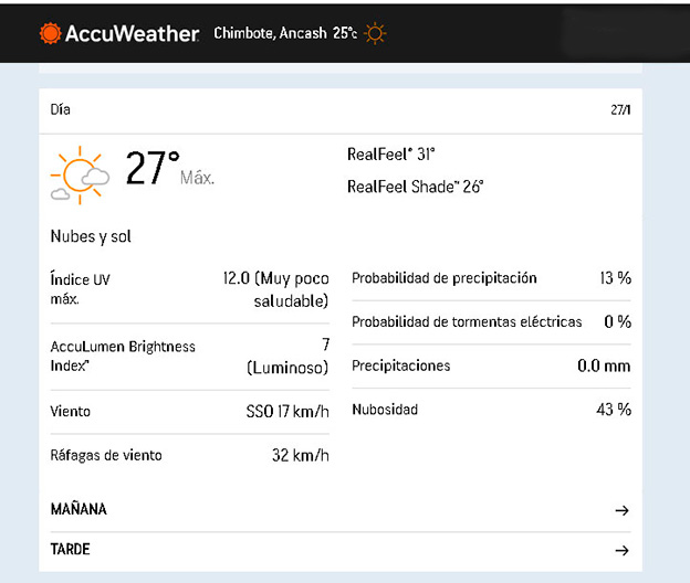 En determinado momento del día se ha llegado a los 27 grados Celsius, según Accu Wheather y además según el pronóstico del Senamhi para hoy martes 27 de enero.