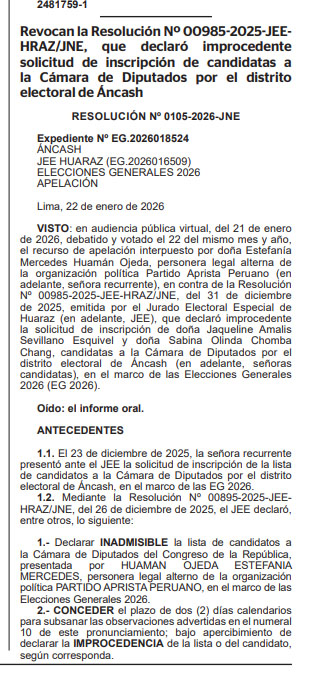En efecto mediante, las resoluciones 00985_2025-JJE/HRAZ/JNE y 124 – 2026-JEE/HRAZ/JNE el Jurado Especial de Huaraz declaró la improcedencia de la inscripción de Jaquelin Sevillano Esquivel y Sabina Chomba por el Partido Aprista Peruano y toda la lista del partido político PRIN.