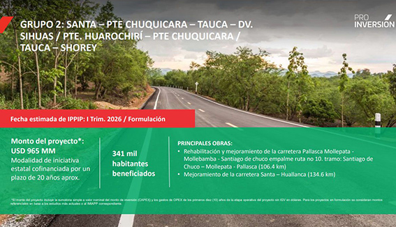 El tercer proyecto es el Corredor Vial Santa – Puente Chuquicara – Tauca – desvío Sihuas. El monto de inversión será de 965 millones de dólares y la declaratoria de interés será en el segundo trimestre del 2026. Incluye el mejoramiento de la carretera Santa – Huallanca. Así como también la carretera Pallasca – Mollepata.