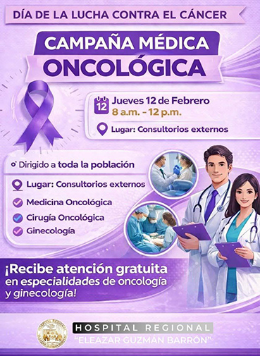 En el marco del Día de la Lucha contra el Cáncer, el Hospital Regional “Eleazar Guzmán Barrón” anunció la realización de una campaña médica oncológica dirigida a toda la población, con el objetivo de promover la prevención y detección oportuna de esta enfermedad.