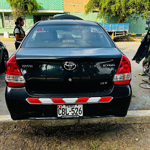 La intervención se ejecutó en el frontis de la manzana Z, del pueblo joven El Porvenir, donde fue ubicado el automóvil de placa falsa CBL-526, marca Toyota, modelo Etios, color negro. El vehículo fue puesto a disposición de la UPIRV para las diligencias correspondientes.