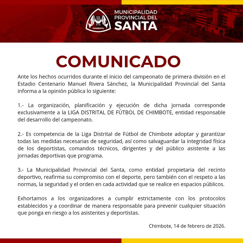 Ante los hechos ocurridos en el estadio Manuel Rivera Sánchez durante el desarrollo de la primera jornada de la primera fecha del campeonato de futbol de primera división que organiza liga de futbol de Chimbote, la Municipalidad Provincial del Santa ha emitido un comunicado, sub rayando que ellos no son los organizadores del evento.