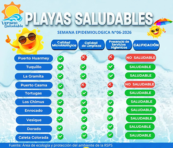 Las playas de Vesique, Dorado y Caleta Colorada, en Nuevo Chimbote, fueron calificadas como saludables y se encuentran aptas para la visita de las familias durante la semana epidemiológica N.° 06-2026. En tanto, Puerto Casma fue considerada no saludable, según el último reporte sanitario.
