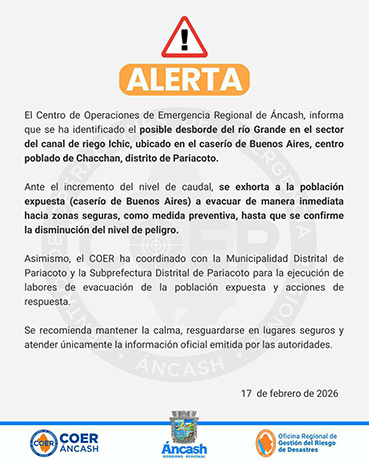 El Centro de Operaciones de Emergencia Regional de Áncash (COER) de Áncash emitió una alerta ante el posible desborde del río Grande en el sector del canal de riego Ichic, ubicado en el caserío de Buenos Aires, centro poblado de Chacchan, distrito de Pariacoto.