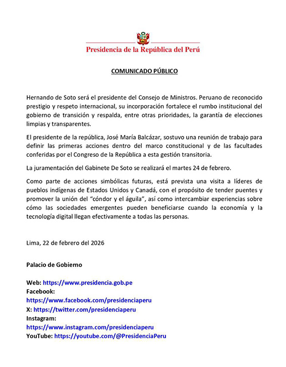 En el comunicado también se dio a conocer que la juramentación de Hernando de Soto y el resto de ministros será este martes 24 de febrero.
