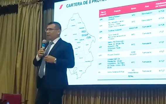 Ocho grandes proyectos de desarrollo en Ancash son los que tiene en cartera para el presente año 2026 ProInversión, según lo expuso por Yaco Rosas Rosales, director de ProInversión, en el Encuentro Empresarial Camino al Desarrollo de la Región Áncash organizado por la Cámara de Comercio del Santa y llevado a cabo en el Centro de Convenciones de la Universidad ULADECH Católica.