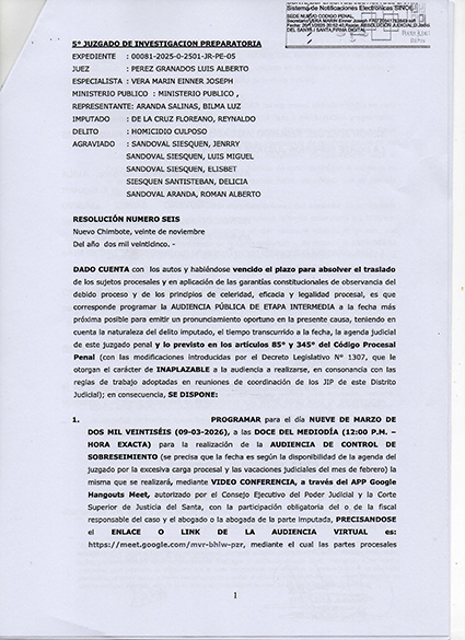 El día de hoy nueve de marzo del 2026, a las doce del día , tal como se muestra en la notificación judicial, se estará llevando a cabo la Audiencia de Control de Sobreseimiento del caso ocurrido en setiembre del 2023, en Pampa Dura, cuando fallece Alberto Sandoval Sandoval ante un disparo que se dijo casual de Reynaldo De la Cruz Floreano.