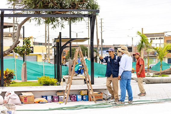 Entre las labores que aún se ejecutan destacan la colocación de terrazos con acabados estampados, la plantación de áreas verdes, la instalación de coberturas de bambucillo y madera tornillo, trabajos de pintura en muros y la limpieza integral del espacio público para garantizar un entorno ordenado y libre de polvo.