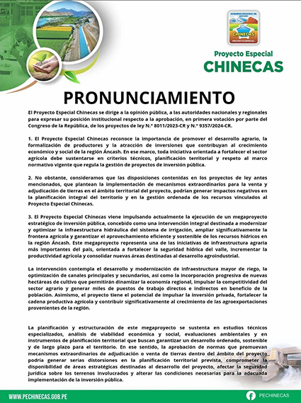 En su posición institucional, Chinecas reconoce la importancia de promover el desarrollo agrario, la formalización de productores y la atracción de inversiones que permitan dinamizar la economía regional. No obstante, enfatiza que cualquier medida relacionada con la adjudicación de tierras debe estar sustentada en criterios técnicos, planificación territorial y respeto al marco normativo que regula la gestión de los proyectos de inversión pública.