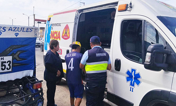 Agentes de Serenazgo de Chimbote acudieron rápidamente al lugar del accidente y brindaron los primeros auxilios al conductor identificado como Wilke Alejos Giraldo (42), quien presentaba un corte en el brazo derecho producto del fuerte impacto.