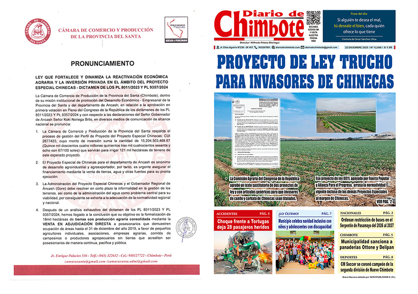 Quienes han hecho el análisis exhaustivo?. Revisaron los documentos de la Comisión Agraria? No se trata de pequeños agricultores se trata de audaces que ocupan extensas áreas de terreno y que con la monserga aquella del inversionista han aplicado una narrativa que perjudicará el futuro del Proyecto Chinecas. Solo la audacia de este grupo ha podido escalar las diferentes instancias en el congreso y a pesar de las opiniones técnicas en contrario del Midagri los congresistas interesados lo aprobaron en diciembre del 2025 tal como lo informó nuestro Diario. En ese momento la directiva de la Cámara de Comercio estaban en otro mundo menos aquí, en Chimbote. (El Editor)