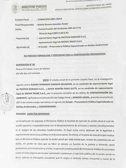 Según ha establecido el Ministerio Público a través de la Fiscalía Especializada en Materia Ambiental, mediante la Disposición Fiscal N°03 del nueve de febrero del presente y que lleva la firma de Evelyn Lamadrid Vences, las empresas Baema Trade Sac y Pacifico Dorado Sac no realizan minería ilegal y no contaminan el ambiente en la zona de Jimbe, en las alturas de la Cordillera Negra en SanLuis de Cochapeti, como se denunció a través de un oficio de la Congresista Kelly Portalatino por parte de los señores Wilmer Cotos Soriano y Juan Carlos SánchezRuíz.