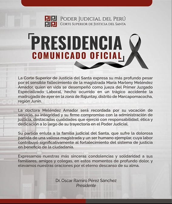 La Corte Superior de Justicia del Santa expresó su más profundo pesar por el sensible fallecimiento de la magistrada María Marleny Meléndez Amador, generando consternación entre sus colegas y la comunidad judicial.