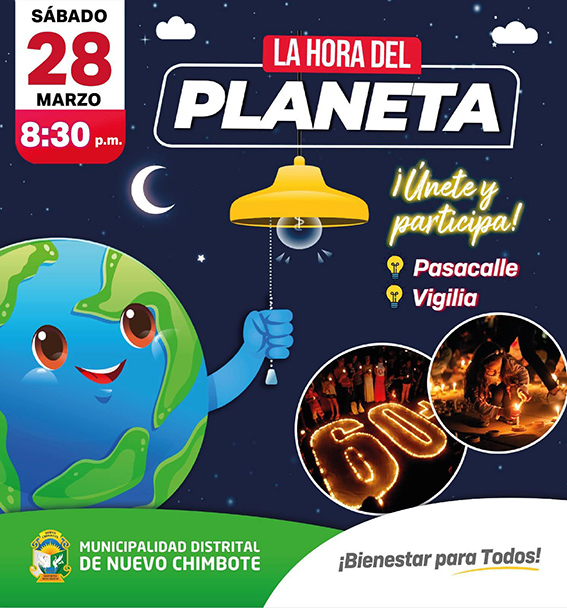Este sábado 28 de marzo, el distrito de Nuevo Chimbote se sumará a la iniciativa global “La Hora del Planeta”, una de las campañas ambientales más importantes a nivel mundial que busca generar conciencia sobre el cuidado del medio ambiente mediante el apagado simbólico de luces.