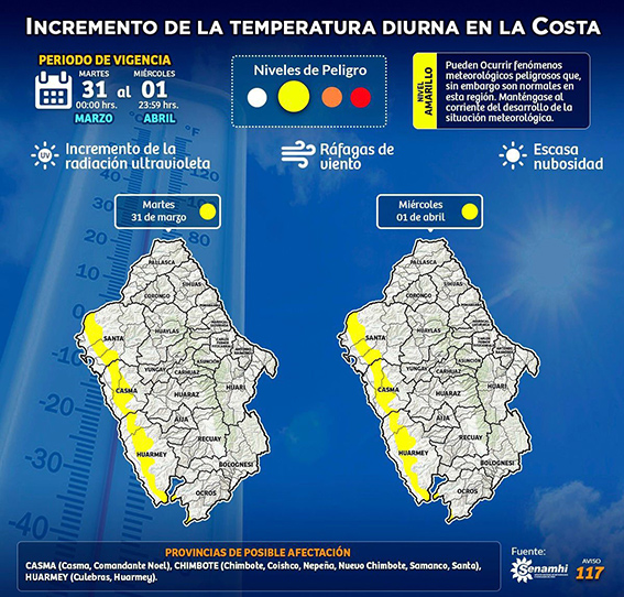 El Centro de Operaciones de Emergencia Regional (COER) de Áncash informó que, entre hoy martes 31 de marzo y el 1 de abril, se registrará un incremento de la temperatura durante el día en la zona costera de la región.
